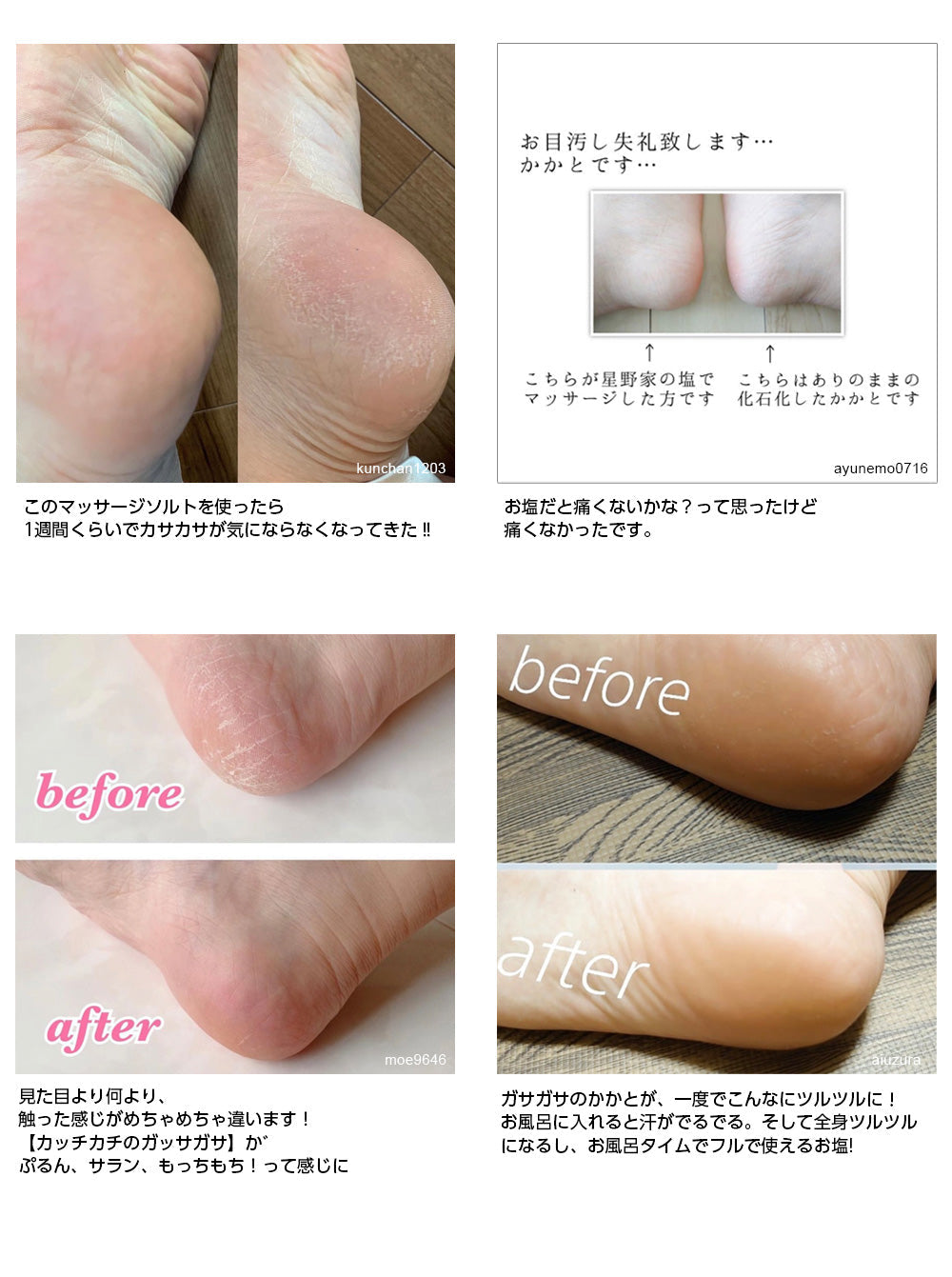 【おかげさまで、販売20年】 ━━━ 店長よりメッセージ ━━━ 母が原材料にこだわって作った 無添加ボディスクラブ 「星野家の塩」は、 おかげさまで販売20年経ちました。 元々はボディケア用に 開発した商品ですが、 シンプル素材で出来ていることから、 お客様が色々なアレンジを クチコミいただいています。 ボディケアや角質ケアだけでなく、 頭皮ケア、ヘアケア、 小鼻の黒ずみケア、 臭いケアバスソルトとして、 また色々なアイテムを混ぜて 使っていらっしゃるという クチコミもございます。 また、全成分食品グレードの 原料を使用しており、 添加物を気にせずにも 安心してお使い頂けますので、 是非お子様を含めご家族でお試し頂き、 お客様に合うご利用法を 見つけて頂ければ幸いです。 皆様の悩み解消に役立ったと 本当に嬉しいです。 これからも星野家の塩が皆様の お役に立てることを願っています。 |